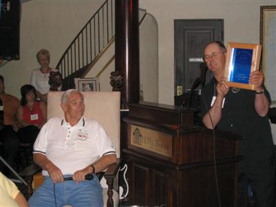 gets a plaque of appreciation from SACC President Max Brockhouse.